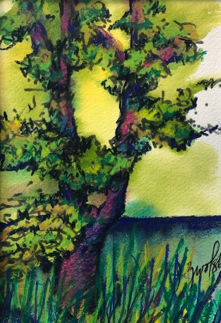 Joann Zwolski ~ Tree at Great Hollow ~ Watercolor-Pencil ~ 11.5×9.5 ~ $125 ~ When I was at the Great Hollow Preserve, the trees spoke to me. There was an abundant amount of trees that were standing strong and beautiful. I painted them again and again.