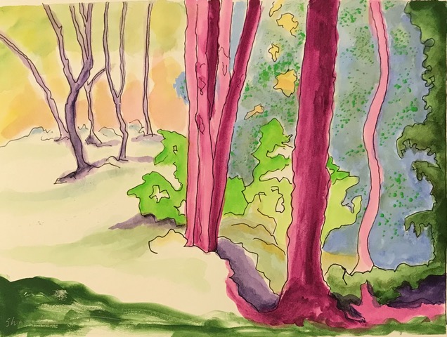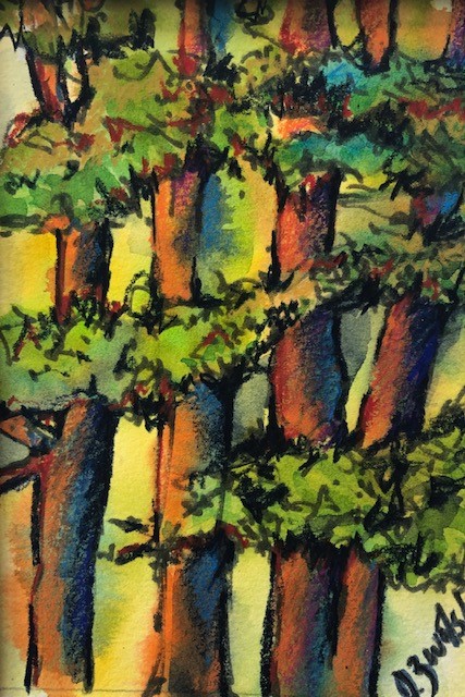 Joann Zwolski ~ Tree Chorus ~ Watercolor-Pencil ~ 11.5×9.5 ~ $125 ~ When I was at the Great Hollow Preserve, the trees spoke to me. There was an abundant amount of trees that were standing strong and beautiful. I painted them again and again.