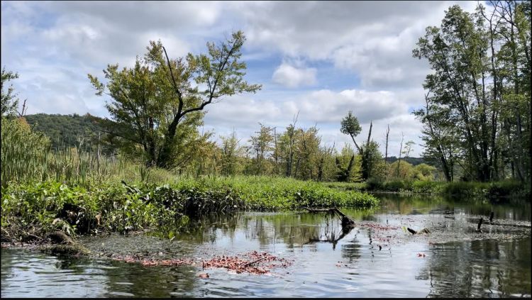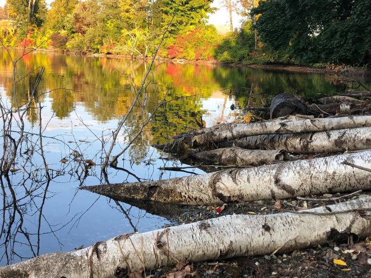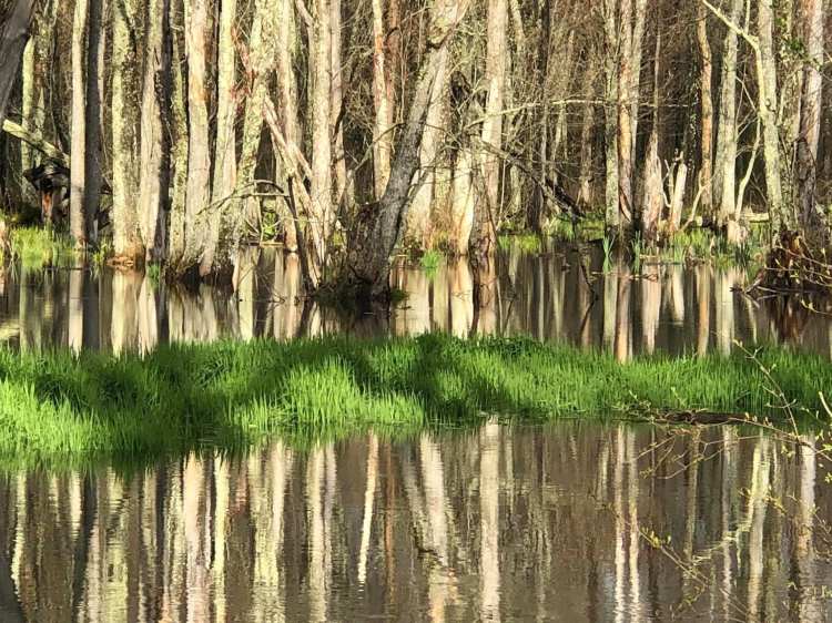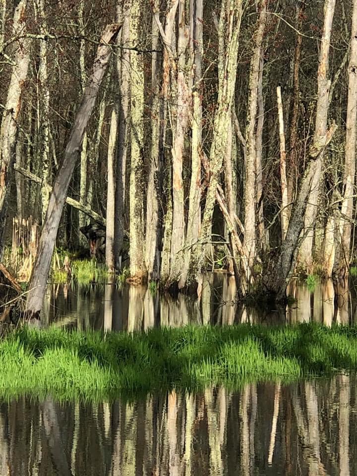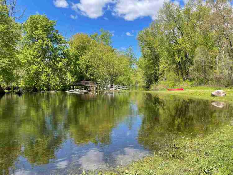 Julie Toscano ~ Spring High Water ~ Photograph ~ 11×14 ~ $75 ~ Early May 2023: after heavy rains, the water level at the Green Chimneys launch area was so high that you couldn’t access the footbridge. Trees were fresh green. Beautiful day for a kayak trip up the river!