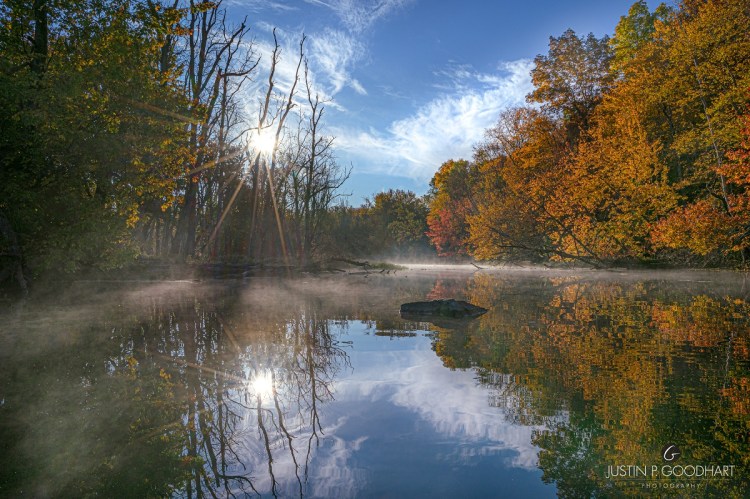 Justin P. Goodhart ~ Double Sunshine ~ Photograph ~ 16×20 ~ $147 ~ There’s nothing quite like autumn colors reflecting in the water with some morning fog. Sipping coffee in my kayak and watching the sunrise over the Great Swamp is one of life’s greatest joys.