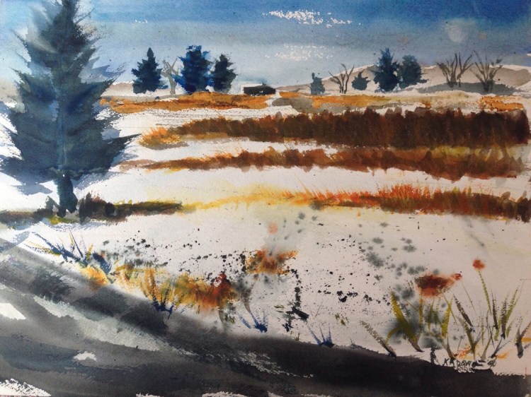 Kathleen Davis ~ Winter Landscape I ~ Watercolor ~ 12×16 ~ $200 ~ I painted this watercolor on location (Lakeside Drive) where I was living during the time. The evergreen trees interspersed with horizontal bands of tall golden-bronze wetland plants against the snowy fields appealed to me. Available in 16″x20″ full color quality print for $50.