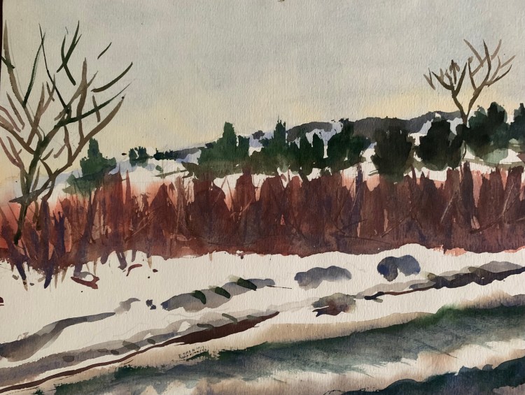 Kathleen Davis ~ Winter Landscape II ~ Watercolor ~ 12.5×17 ~ $300 ~ I painted this watercolor from a photo I took along Lakeside Drive overlooking the Umshied property. The white of the snow in contrast to the swath of tall golden-bronze wetland plants with evergreen trees in the background and snowy road in the foreground created a beautiful landscape that I tried to capture. Available in 16″x20″ full color quality print for $50.