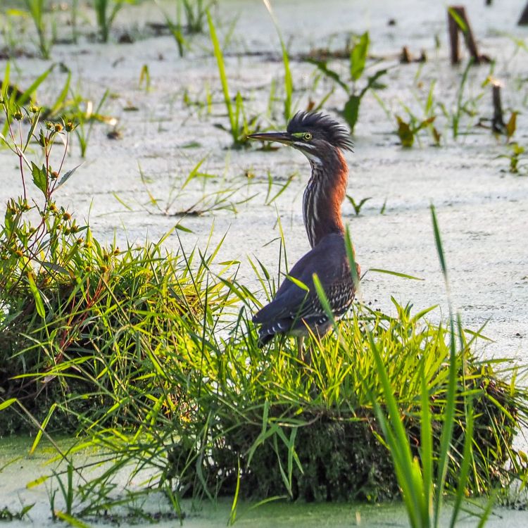 Linda Hubbard ~ Like My Hair Do? ~ Photograph ~ 10×10 ~ $85 ~ This green heron at Wimisink in the evening light seems to be showing us his beautiful colors.. and his great hair do!