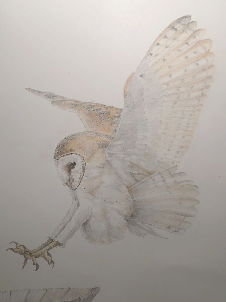 Marion Comins ~ BarnOwl ~ Colored Pencil ~ 16×20 ~ $450 ~ This work represents a bird that is found in the Great Swamp and is a composite from photographs that I have taken, as well as researched pictures.