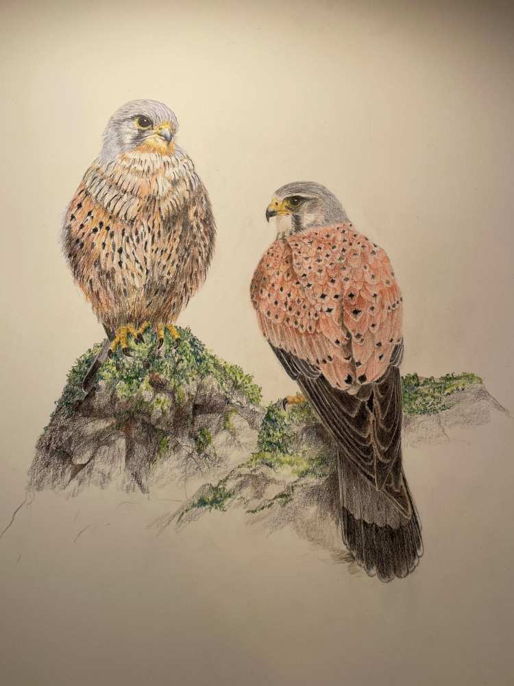 Marion Comins ~ Kestrels ~ Colored Pencil ~ 15×19 ~ $500 ~ This work represents a bird that is found in the Great Swamp and is a composite from photographs that I have taken, as well as researched pictures.