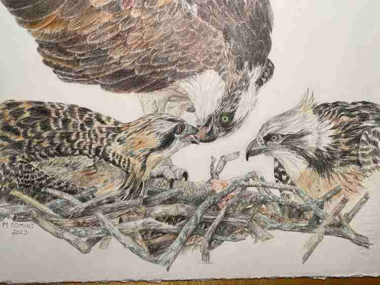 Marion Comins ~ Osprey with young ~ Colored Pencil ~ 14×17 ~ $500 ~ This work represents a bird that is found in the Great Swamp and is a composite from photographs that I have taken, as well as researched pictures.