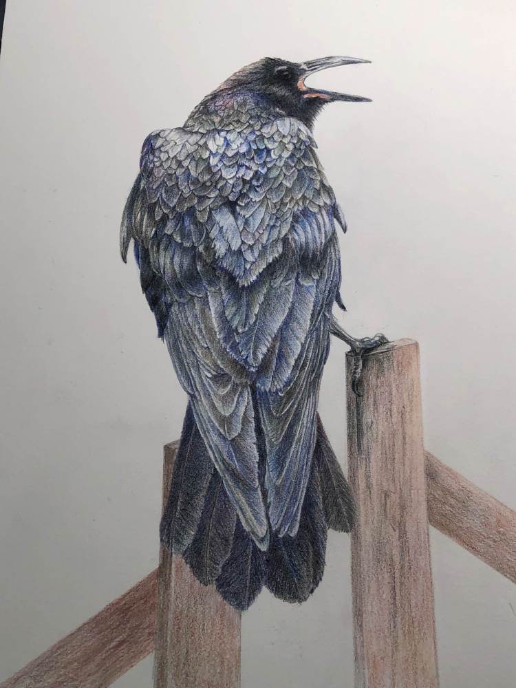 Marion Comins ~ Raven ~ Colored Pencil ~ 15×19 ~ $500 ~ This work represents a bird that is found in the Great Swamp and is a composite from photographs that I have taken, as well as researched pictures.
