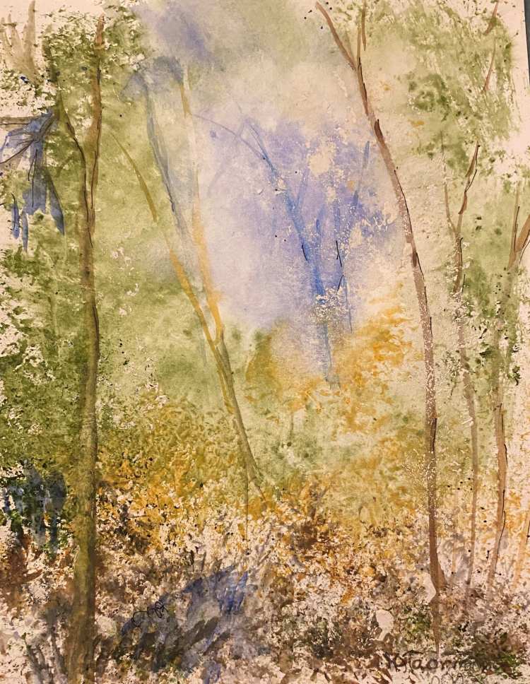“Mary Ann Taormina ~ A Walk in the Woods ~ Watercolor ~ 9×12 ~ $100 ~ “The woods are lovely dark and deep”. Robert Frost. I became mesmerized when sun shined through the foliage and branches and plays tricks on my eyes at Clough Preserve on Farm to Market Road in Patterson NY.”