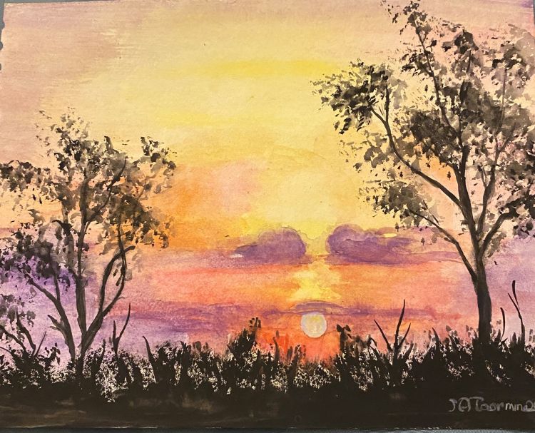 Mary Ann Taormina ~ Putnam Sunset ~ Watercolor ~ 9×12 ~ $100 ~ The sunset paints the sky with pink, purple and yellow over the field on Farm to Market Road in Southeast, NY. It is a time to rest, dream and reset for the next day.
