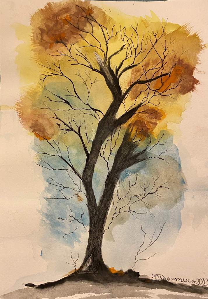 Mary Ann Taormina ~ The Lonely Tree ~ Watercolor ~ 14×10 ~ $100 ~ A lonely tree, deep in the woods near the Ice Pond in Southeast, NY. The old sturdy tree stands tall. Its branches reach for the light as its roots anchors it securely to the earth.