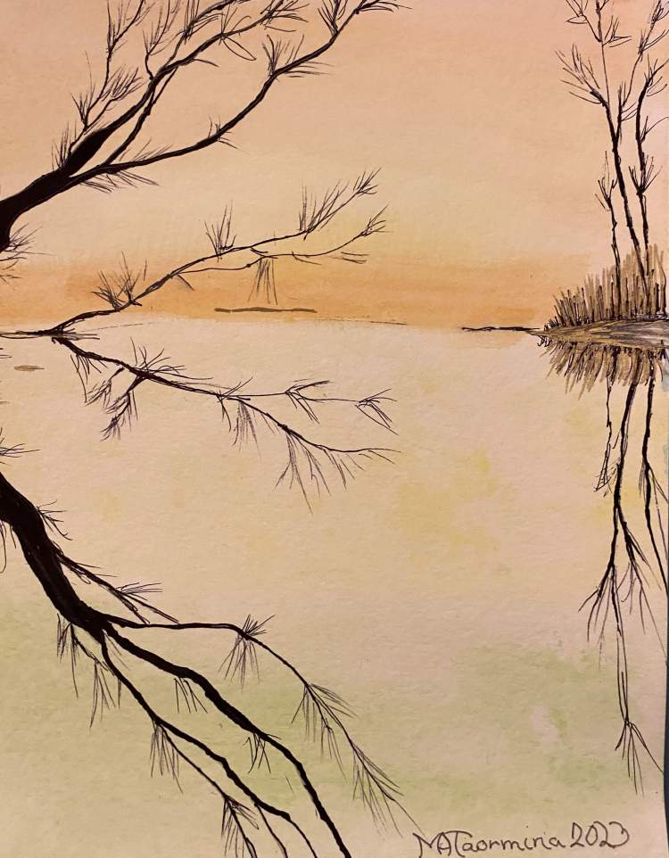 Mary Ann Taormina ~ Winter Day ~ Watercolor ~ 9×12 ~ $100 ~ Where the Great Swamp meets the Bog Brook Reservoir on a winter day. A gentle wind passes through the bare branches as the tree quietly prepares its buds for the coming spring. Sleeping, waiting, preparing.