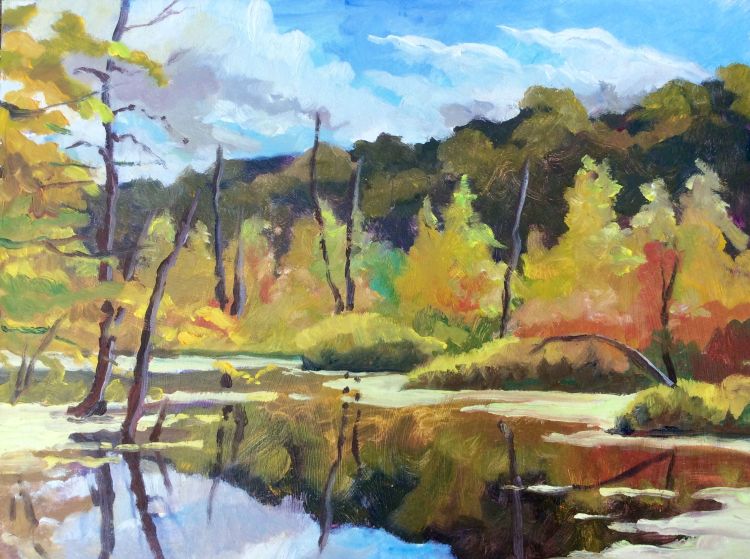 Diane Baresich ~ Morning Light at Oblong 2023 ~ Acrylic ~ 9×12 ~ $220 ~ Patterns in the water and reflections from the sky drew me to pause my morning walk at the Oblong Land Conversancy. View from the Maybrook Rail Trail just off Routes 292 and 55.