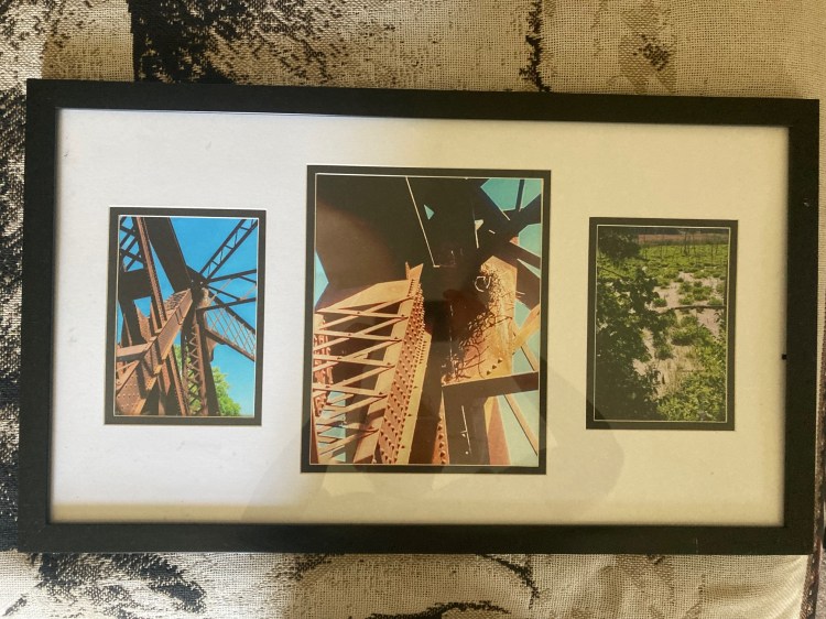Donna Castelluccio ~ Get Over It ~ Photograph ~ 12×24 ~ $100 ~ Photo of bridge near Ray Lake on Douglas property. Printed on canvas, branch with rope for hanging. I love to follow paths and cross bridges.