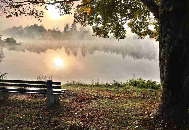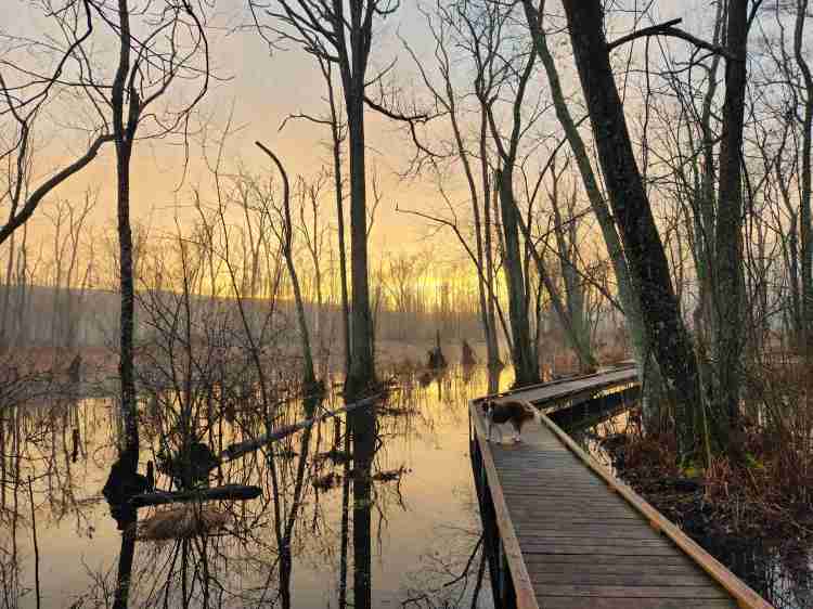 Alice Lynn ~ Sunrise From the Footbridge ~ Photograph ~ 12×18 ~ $150 ~ On the foot bridge over the peaceful East Branch of the Croton River on a perfect spring morning greeting the new day. May 2023, Brewster, NY