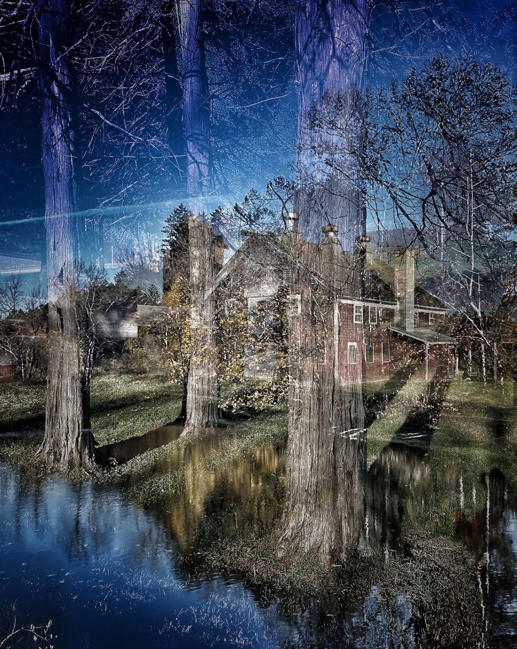 Phyllis Chadwick ~ Lakeside ~ Photograph ~ 28×36 ~ $500 ~ Lakeside Park has been a place close to my heart. There is so much beauty there. This photo manipulation combines three areas I enjoy the most when visiting. The beautiful lake with its wildlife, the crop of pines and the old barns at the top of the hill.