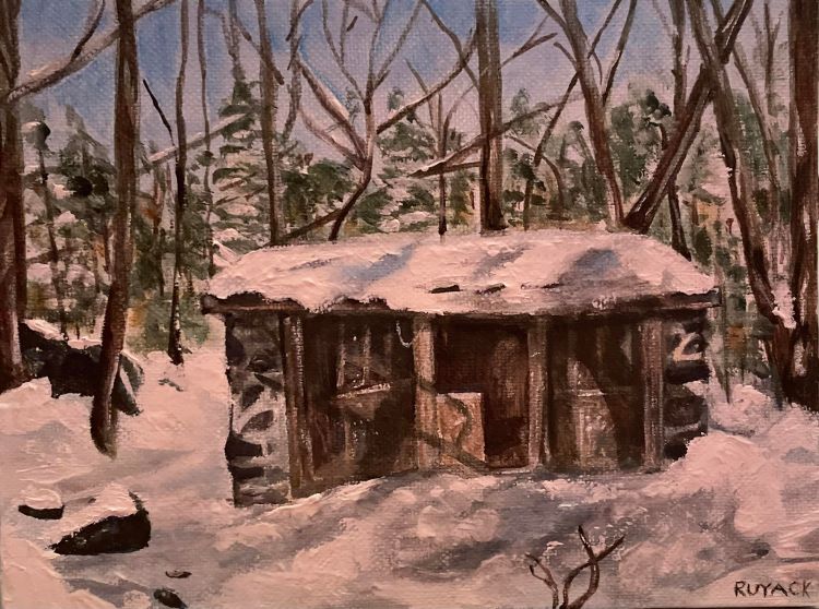 Rebecca Ruyack ~ A Place to Rest ~ Acrylic ~ 6×8 ~ $100 ~ A cabin in the serene quietude of winter at Ciaiola Conservation. In the midst of my painting at Ciaiola Conservation, I envisioned the cabin as a peaceful refuge, a place to find solace and shelter from the winter’s embrace.