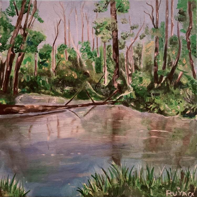 Rebecca Ruyack ~ Patterson Beach ~ Acrylic ~ 10×10 ~ $125 ~ The swamp at Patterson Environmental Park holds a special place in my heart. Growing up near this swamp, it was a cherished spot where I spent countless moments with family, friends, schoolmates and pets. We fondly call this spot the “Patterson Beach,” our local tourist attraction.