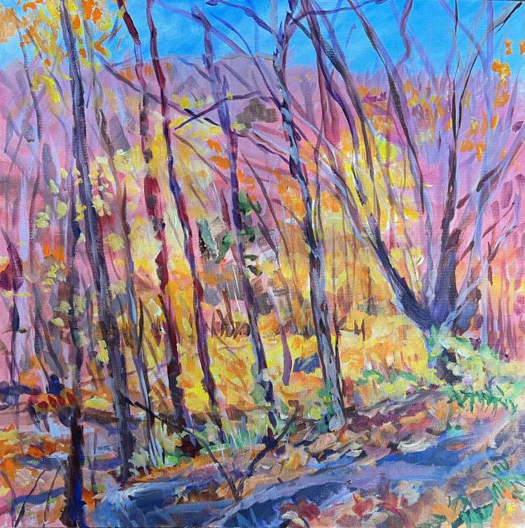 Rebecca Rabinowitz ~ Autumn Near The Ice Pond ~ Acrylic ~ 20×20 ~ $1200 ~ Autumn light and color enjoying the pinks in the distant hills and rich oranges of leaves and purple blue shadows. This painting is a lesson of warms and cools and capturing light. Painted outside in nature.