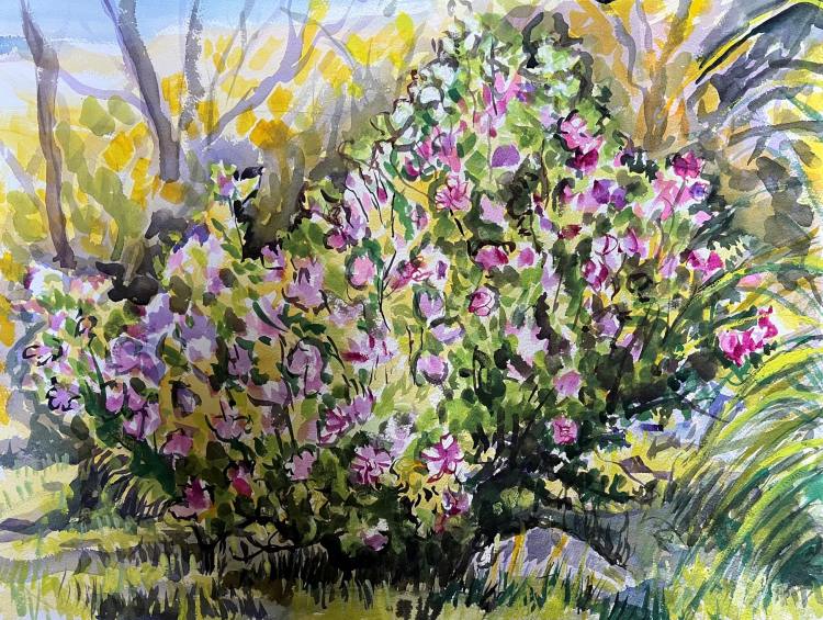 Rebecca Rabinowitz ~ Rose Of Sharon ~ Watercolor ~ 18×20 ~ $950 ~ I am awed by the Rose Of Sharon’s bright fuschia and magenta blossoms and sturdy stems. The joy and struggle is painting the light setting from behind. Painted outside in nature.