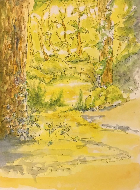 Georgine Honohan ~ The Great Swamp near Patterson ~ Watercolor and Ink ~ 11×14 ~ $250 ~ Painted thinking about the peace and freshness that the Great Swamp offers to all who visit. I remembered many happy hours deep in the Swamp in a canoe, soaking up the sparkle of the water the lush green plants and the surprising joy of spotting the wildlife.