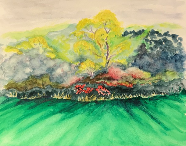 Amanda Epstein ~ Zaengle Preserve ~ Watercolor ~ 11.5×15.5 ~ $750 ~ I am thankful to the Friends of the Great Swamp for pointing out this beautiful view of the Donald and Ann Zaengle Preserve that was accessible from the road. It was a joy to paint.