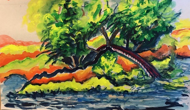 Sharon Nakazato ~ The Red Bridge ~ Mixed Media ~ 11×18 ~ $375 ~ Trying to capture the intensity of color toward a certain dusk at Green Chimneys.